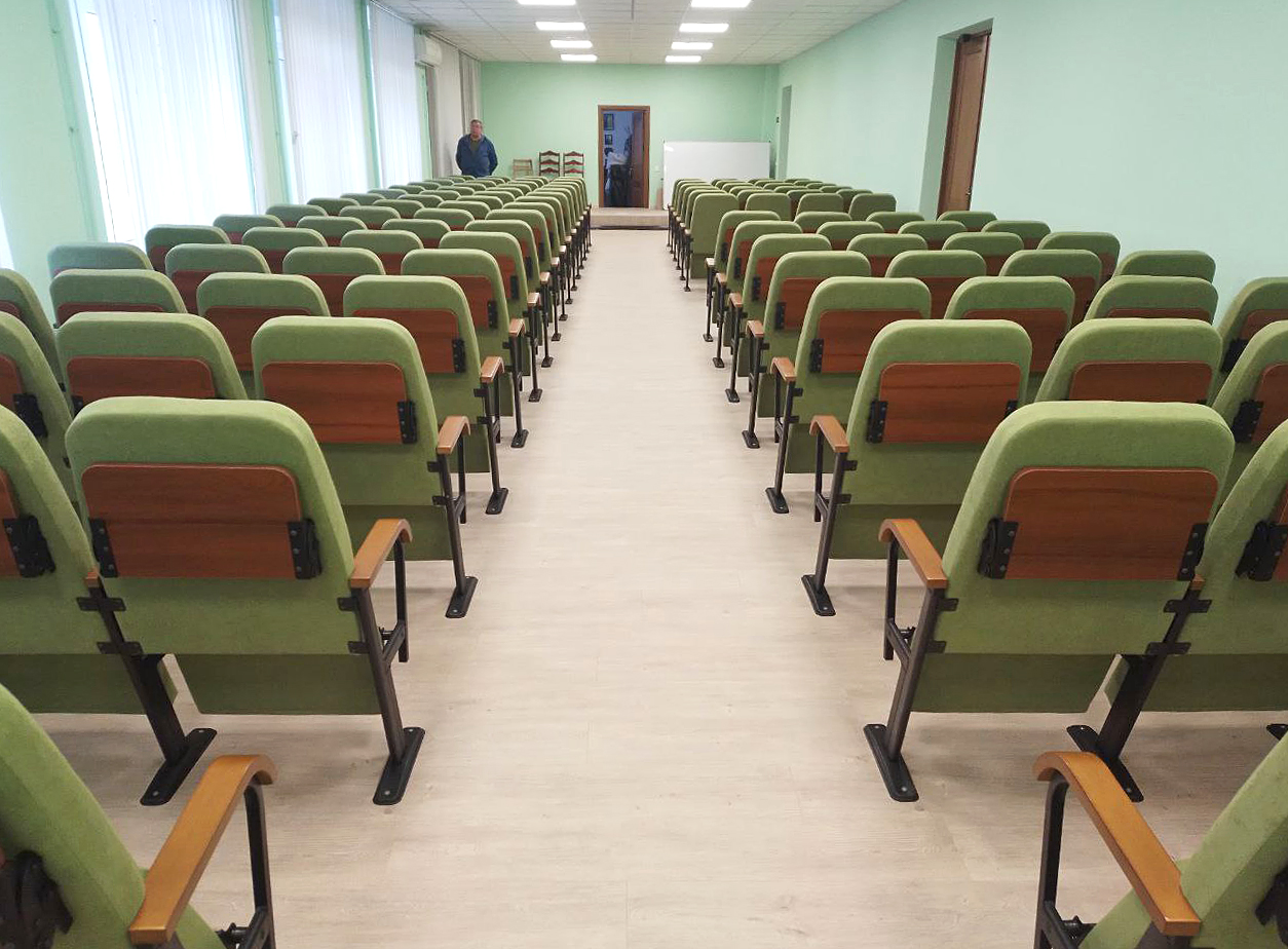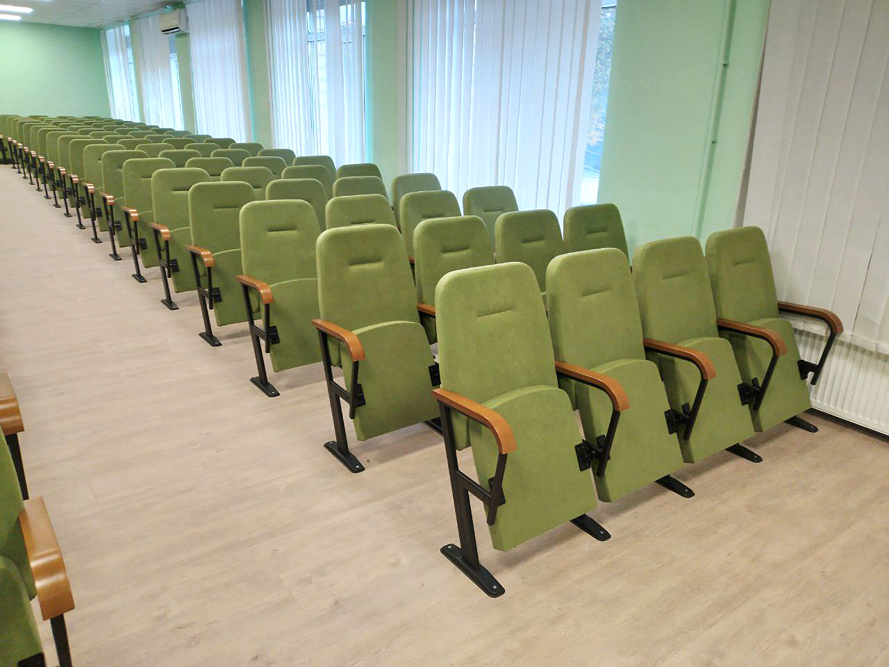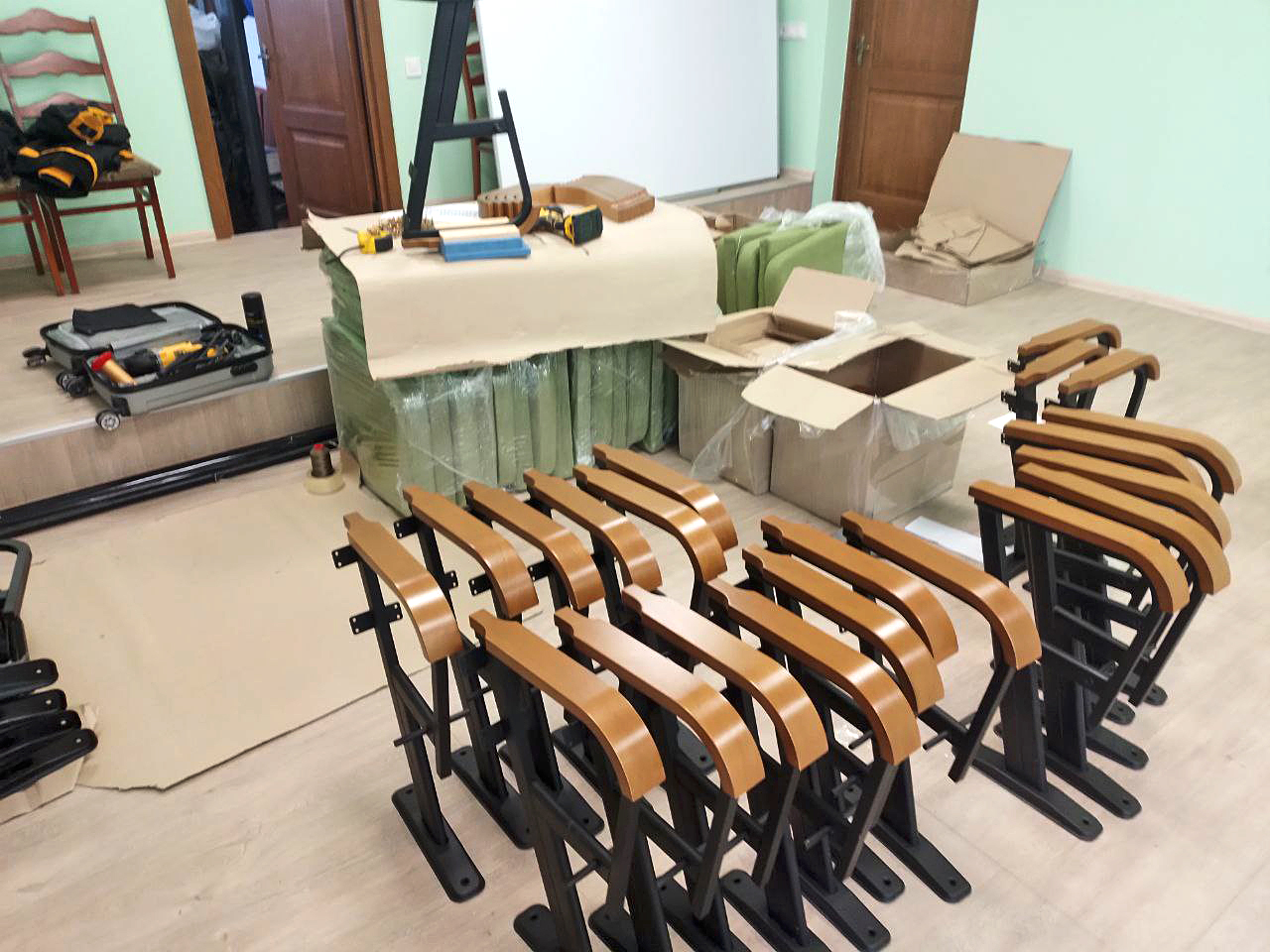 Враховуючи дерев’яну підлогу ми застосували стаціонарне кріплення крісел, що створює стабільні ряди та гарантує безпечну експлуатацію при повному завантаженні залу.