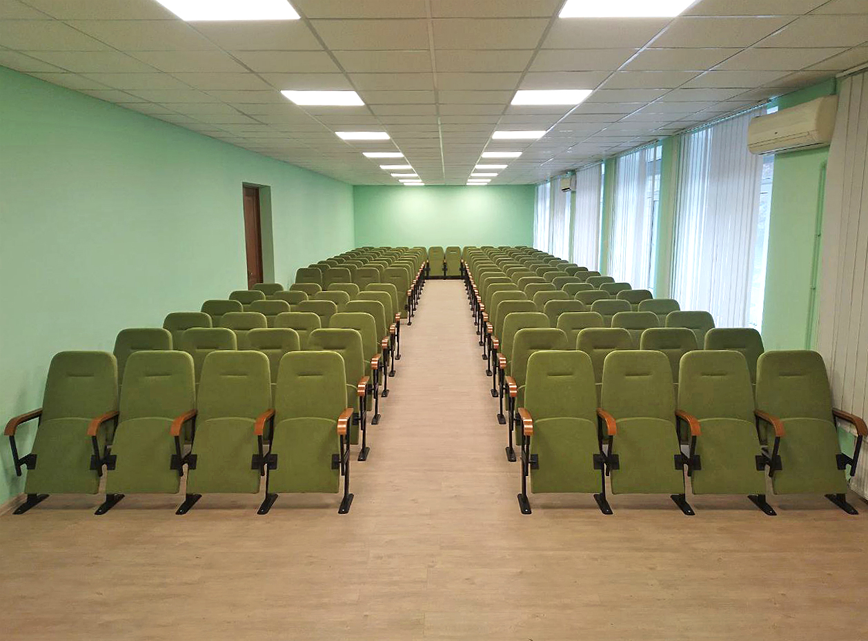 Для організації 138 робочих місць ми запропонували м’які крісла «Акорд» ― одну з найкомпактніших моделей крісла для актових та аудиторних залів. З метою раціонального використання площі, крісла змонтували в 32 секції по 4 крісла та 1 секцію на 10 крісел для заднього ряду. Таке комплектування дозволило раціонально використати площу приміщення без втрати комфорту для учасників та забезпечити зручні проходи між рядами шириною 1120 мм.