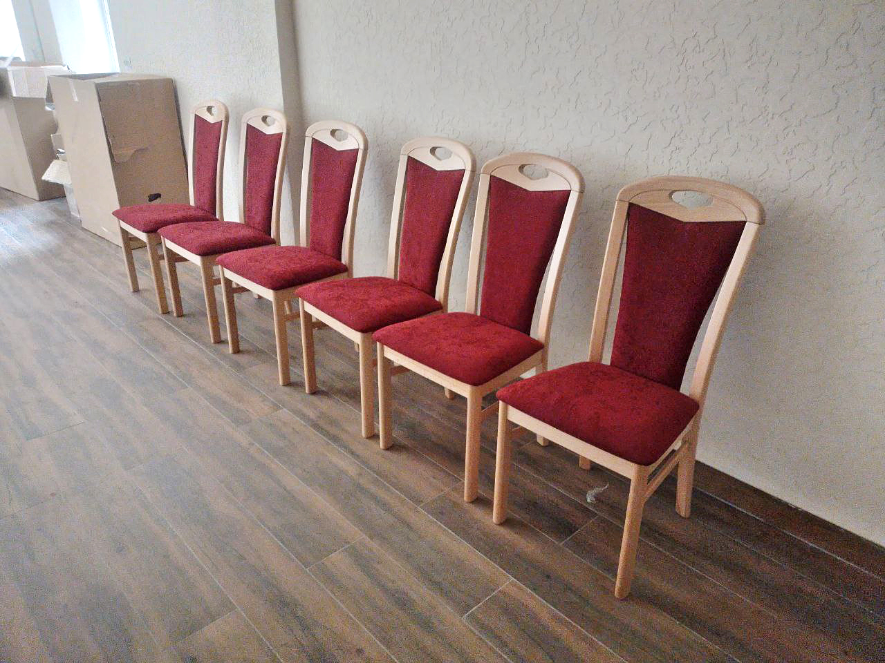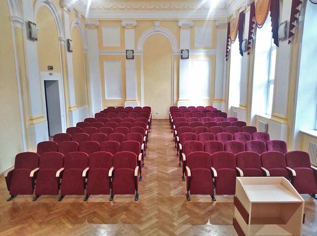 Рішення щодо кольору оббивки крісел було прийняте з огляду на архітектуру актової зали. Благородний бордовий відтінок на тлі кремово-білих стін і світлого паркету створює врівноважений контраст, додає урочистості і водночас зберігає камерність. При денному світлі з великих вікон тканина виглядає глибокою та матовою, а у вечірньому освітленні дає м’яку гру півтонів без відблисків. З практичного погляду, відтінок обрано так, щоб мінімізувати візуальне зношення в зоні інтенсивної експлуатації (краї сидіння/спинки, лінії швів), а сама фактура тканини працює на приховування дрібних відбитків чи пилу між прибираннями.