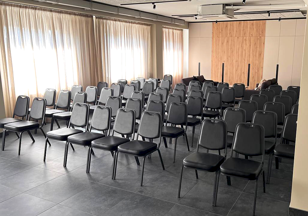 Стілець Інтера — це базова, але дуже надійна модель для залів, конференц-приміщень, громадських просторів. Легка вага і мобільність цих стільців дозволяє змінювати розташування в залежності від потреб конкретного заходу, а з’єднувальні зачепи — формувати рівні ряди і гарантувати безпечне розміщення гостей. 60 стільців виконані у чорній штучній шкірі із металокаркасом у кольорі антрацит. Мінімалістичний, водночас стриманий і сучасний дизайн чудово доповнив загальний стиль залу.