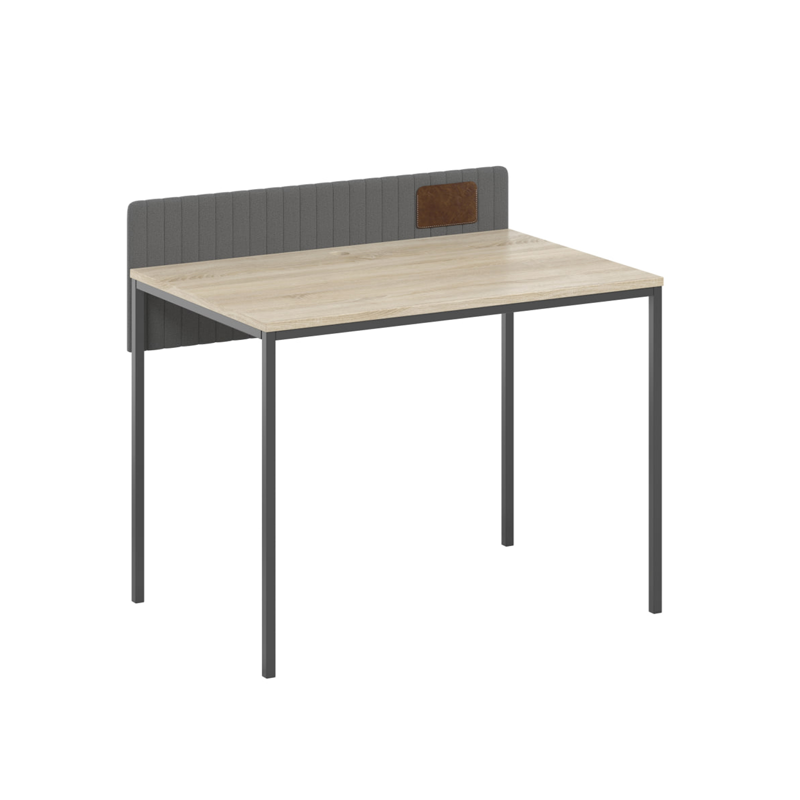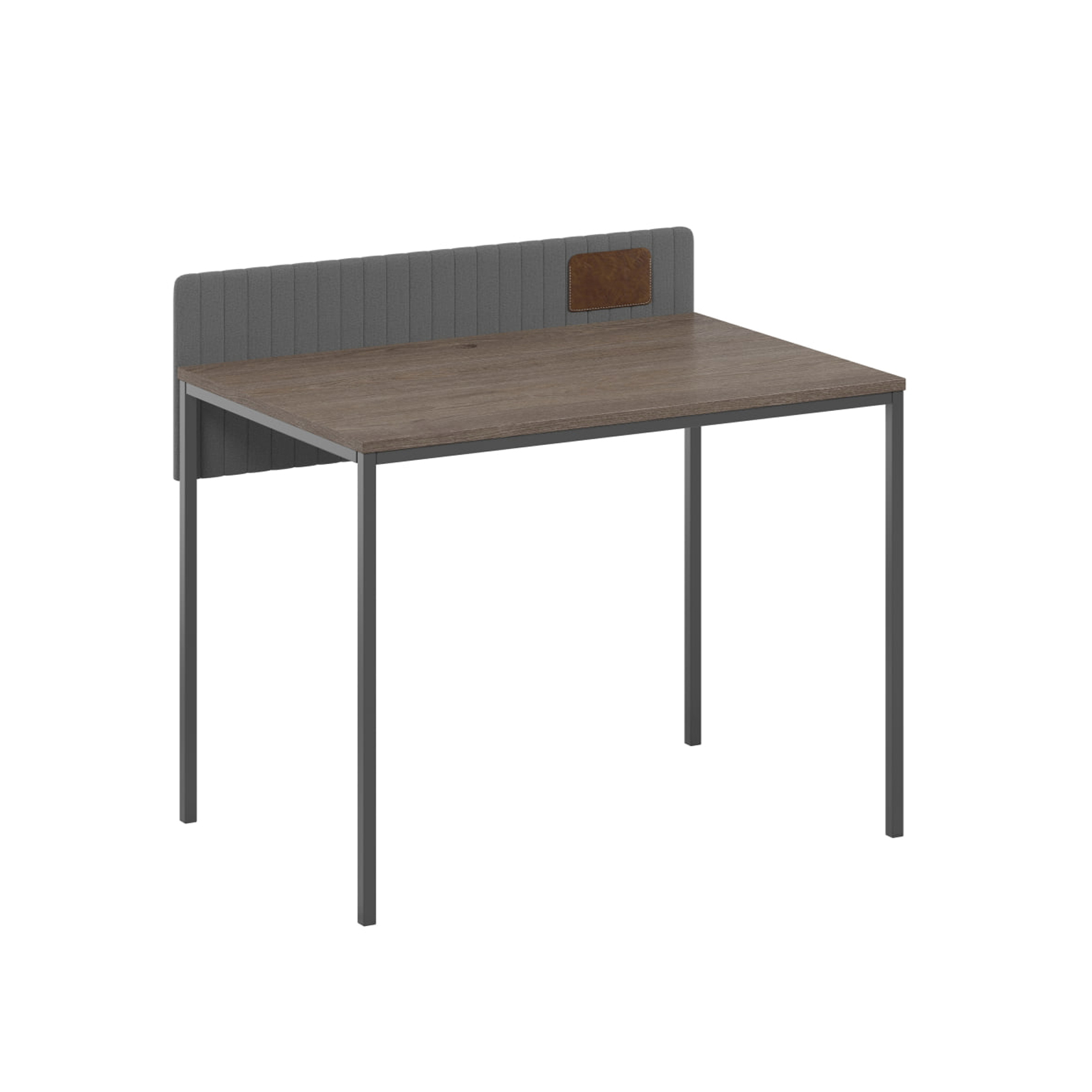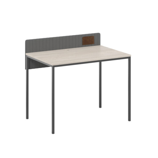 Лицьова панель столу обтягнута сірою тканиною шеніл Alaska 97 з поролоновою підкладкою та можливістю приколювання нотаток на тканині. Кишеня для ручок та паперів зроблена з натуральної шкіри коричневого кольору. У стільниці є отвір для дротів.