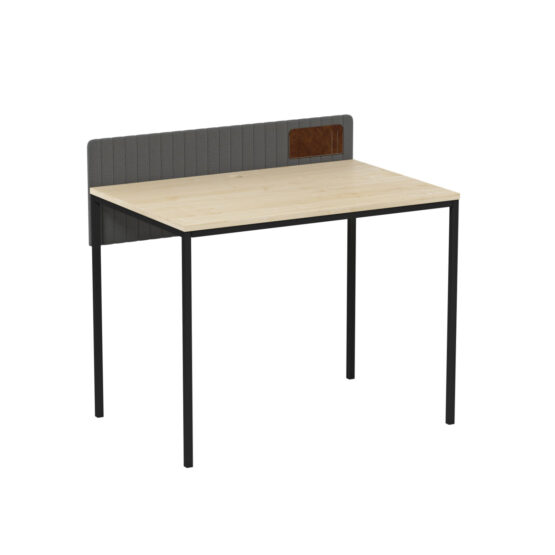 Лицьова панель столу обтягнута сірою тканиною шеніл Alaska 97 з поролоновою підкладкою та можливістю приколювання нотаток на тканині. Кишеня для ручок та паперів зроблена з натуральної шкіри коричневого кольору. У стільниці є отвір для дротів.