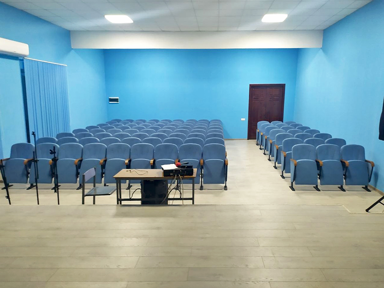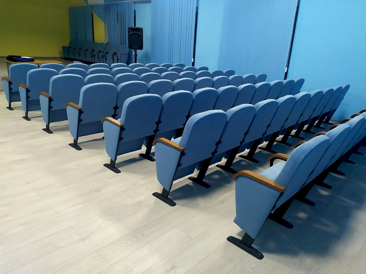 Проект предусматривал установку 102 посадочных мест. Наши конструкторы разработали оптимальную схему расположения, чтобы обеспечить удобные проходы и максимальную видимость сцены из любой точки зала. Секции смонтированы по 3 кресла, основная группа с надежным стационарным креплением к полу, что гарантирует полную безопасность во время массовых мероприятий, исключает опрокидывание или смещение рядов. 3 секции заднего ряда оставили мобильными, что позволяет изменять конфигурацию зала под конкретные потребности учебного заведения ― освободить пространство для дополнительной техники или создать зону для маломобильных групп населения.