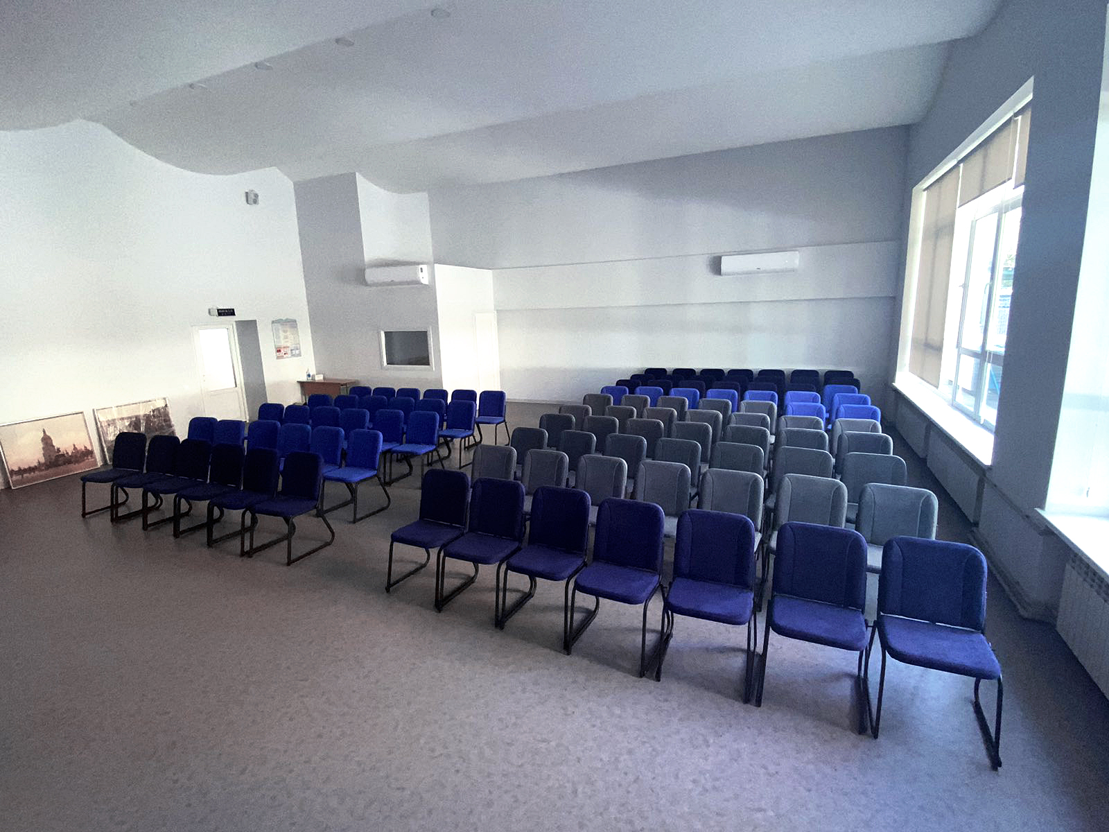 Для актового зала школы было изготовлено 100 стульев на черном каркасе с интересным сочетанием цветов обивки: 33 стула в синем цвете, 33 – в сером, 34 – в темно-синем. Фигурная спинка стула и мягкое сиденье, изготовленное из литого формованного пенополиуретана, по комфорту и удобству использования ничем не уступает полноценному актовому креслу. Эргономика этой модели обеспечивает комфортное размещение посетителей на протяжении всего периода длительных мероприятий.