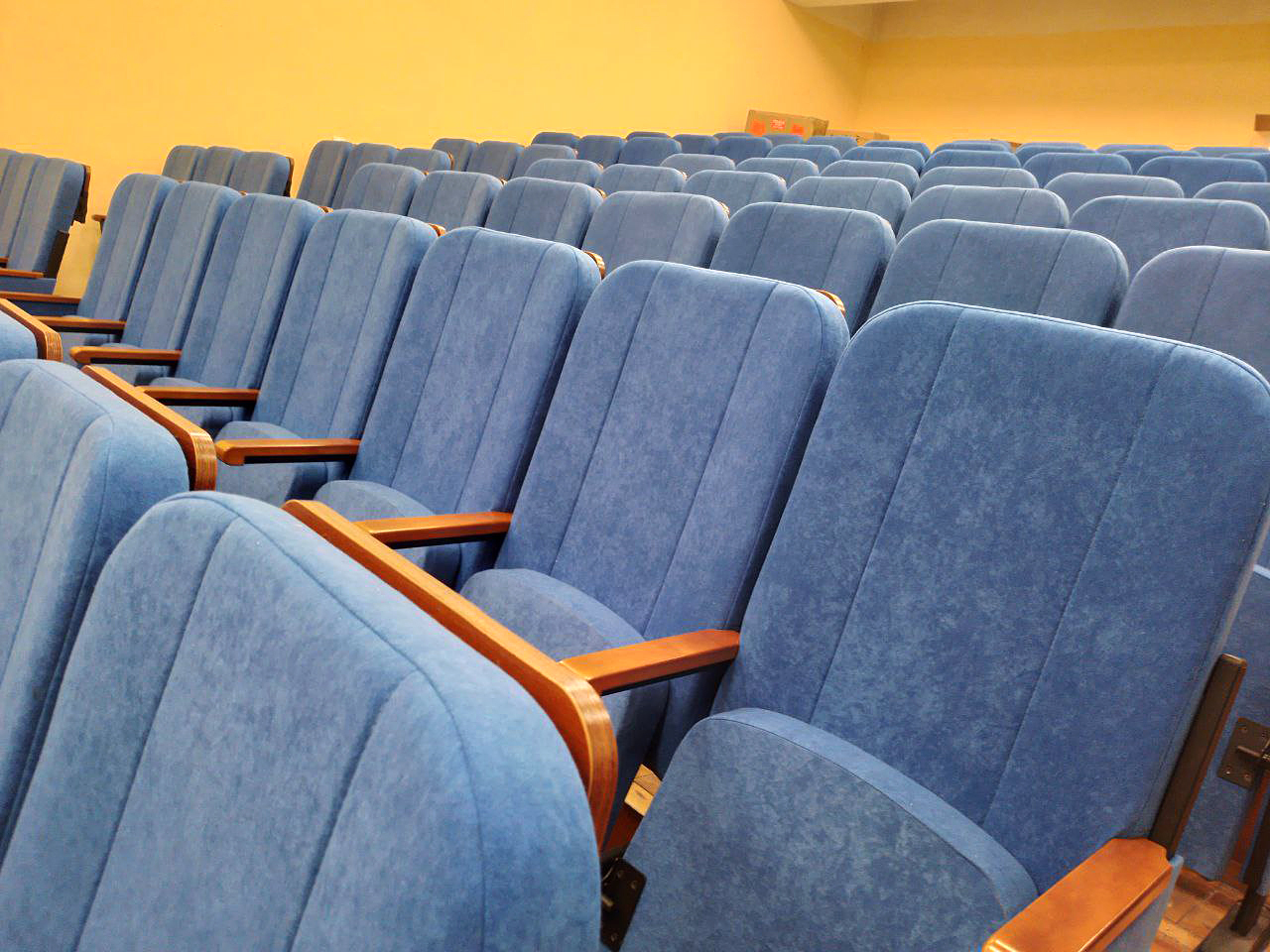 117 посадочных мест выполнены в формате 9 секций по 7 кресел и 18 секций по 3 кресла. Из-за наличия ступенек в зале мы доработали конструкцию кресла «Аллегро», адаптировав ее к особенностям помещения. Нестандартная высота кресла и специальный угол наклона стойки обеспечили максимальный комфорт для зрителя из любого ряда.