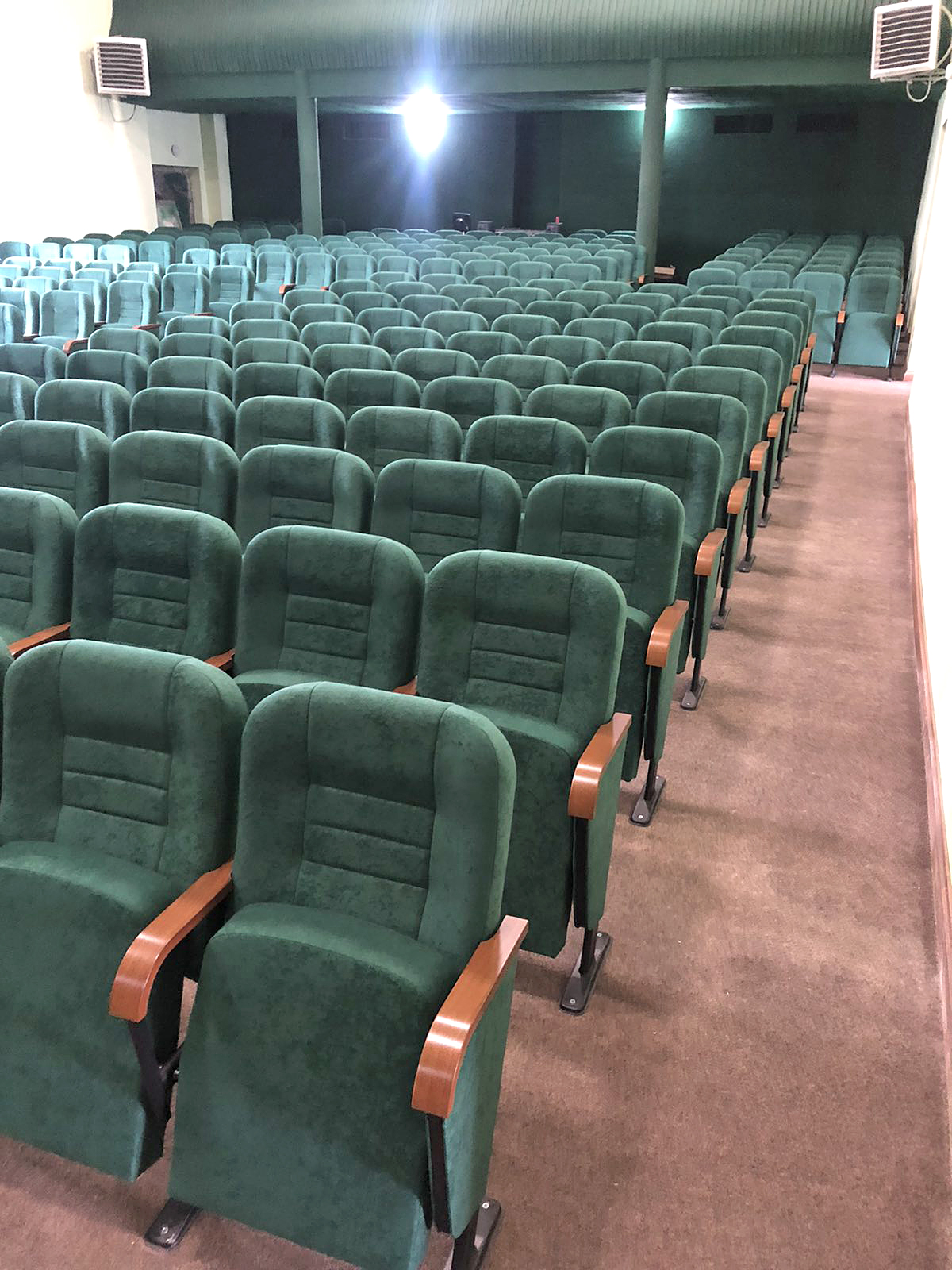 • Конструкция: Кресла закреплены к полу, что гарантирует безопасность зрителей. Использована комбинация закрытых крайних стоек и открытых центральных стоек для визуальной легкости рядов.